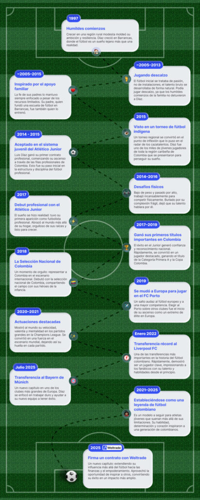 El camino de Luis Díaz es un ejemplo de los resultados que se pueden lograr mediante trabajo duro y determinación. Desde jugar en canchas en Barrancas hasta aparecer en algunos de los escenarios más grandes de Europa, ha demostrado que el talento es importante, pero el esfuerzo y el compromiso son igual de vitales. Su historia también se conecta con la vida más allá del fútbol. Se trata de identificar oportunidades, trabajarlas y tomar decisiones sabias a lo largo del camino. Su asociación con Weltrade destaca una creencia compartida en el empoderamiento y el potencial de crecimiento, alentando a todos a esforzarse por su propia versión del éxito.